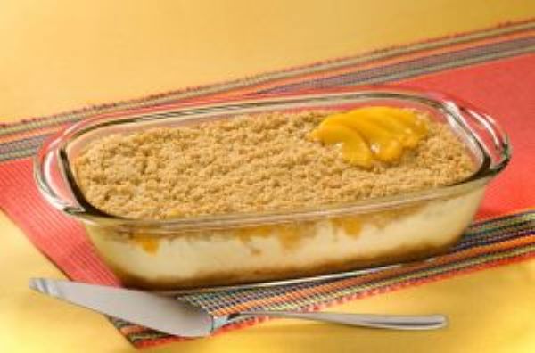 - Unte uma forma média retangular com manteiga ou margarina polvilhada com farinha de trigo, acomode metade da massa farofinha, despeje o recheio e por cima espalhe o pêssego picado, cubra com o restante da massa farofinha e leve ao forno médio (180ºC) preaquecido e deixe assar por 50 minutos.