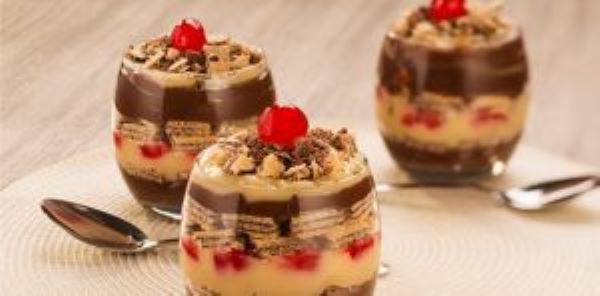 - Em um copo arrume na seguinte ordem: camada do brigadeiro, biscoito quebrado, brigadeiro branco, cereja picada, biscoito quebrado e brigadeiro;