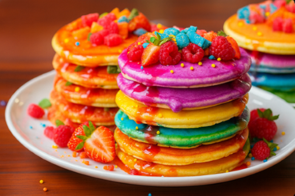 Use a criatividade na montagem. Monte as panquecas intercalando as cores como um arco-íris. Despeje pequenas porções da calda colorida por cima. Finalize com frutas, confeitos e folhas de hortelã. Sirva em seguida.