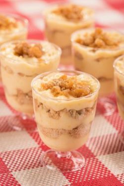 – Fazer várias camadas do creme com a farofa do biscoito em taças individuais e finalizar com o crocante.