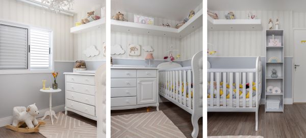 Outro exemplo de quarto de bebê da VilaVille Arquitetura repleto de praticidade. Ele tem berço, cômoda, espaço para troca de fraldas, móveis e prateleiras de apoio. Tudo isso com uma decoração em tons leves para promover uma atmosfera tranquila | Foto: JP. Image