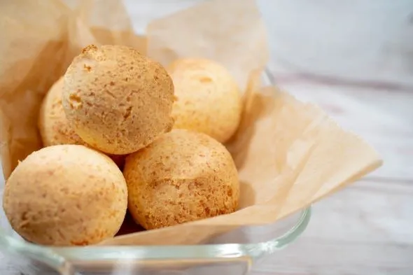 Para modelar os pães de queijo: coloque um pouco de óleo num pires para untar as mãos; com uma colher, retire uma porção da massa e enrole do tamanho de uma bola. Transfira o pão de queijo modelado para a assadeira untada e repita com o restante deixando espaço de 4 cm entre cada um, pois eles crescem ao assar. Leve ao forno por cerca de 40 minutos, até crescer e dourar.